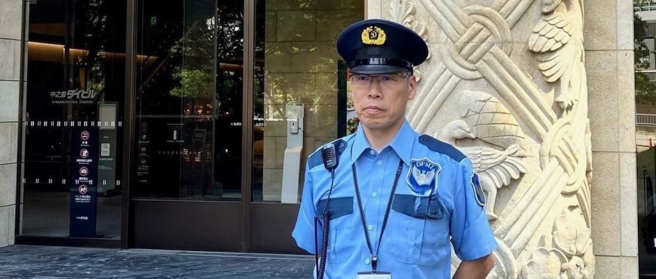 ビルの巡回、立哨、防災センターでの監視業務以外にもお客様一人一人に気持ち良く働いて頂きたいとの思いから毎朝、玄関前等で挨拶を行っています。